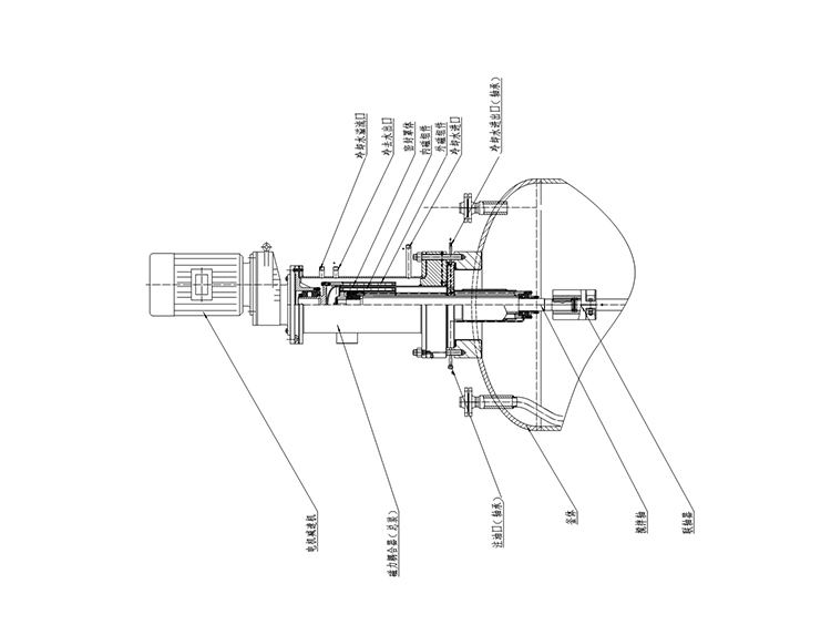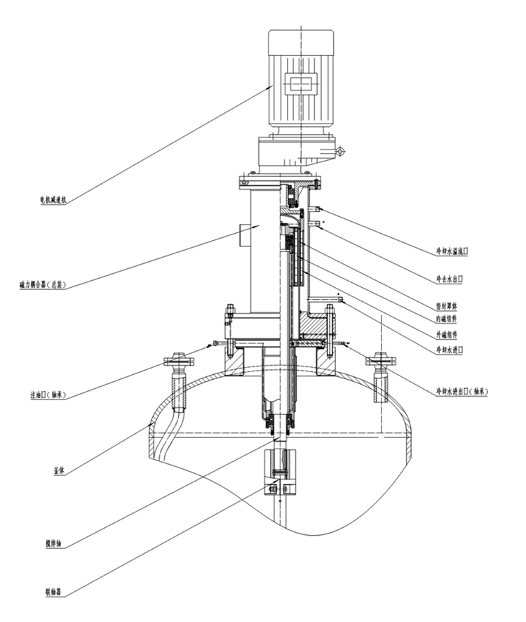 用(yong)稀(xi)土永磁(ci)制(zhi)作(zuo)的強磁(ci)回(hui)轉(zhuan)式(shi)(shi)耦(ou)合(he)結構(磁(ci)力(li)驅(qu)動裝(zhuang)置),磁(ci)力(li)驅(qu)動裝(zhuang)置的基本制(zhi)造材料均為鐵磁(ci)性物質(zhi),磁(ci)導率極(ji)佳,磁(ci)場(chang)在(zai)穿(chuan)過(guo)用(yong)于密封合(he)金層時幾(ji)乎沒有(you)損(sun)耗。由此外部驅(qu)動永磁(ci)體(ti)產生的旋(xuan)轉(zhuan)磁(ci)場(chang)可(ke)以有(you)效被(bei)內(nei)部永磁(ci)體(ti)轉(zhuan)子接(jie)受(shou),進(jin)(jin)而帶(dai)動反應器內(nei)的攪(jiao)拌部件進(jin)(jin)行(xing)物料混(hun)合(he),攪(jiao)拌速度為0~300r/min,甚至更高,可(ke)配推進(jin)(jin)、槳(jiang)式(shi)(shi)、錨式(shi)(shi)、框式(shi)(shi)、螺帶(dai)等各(ge)種(zhong)槳(jiang)。